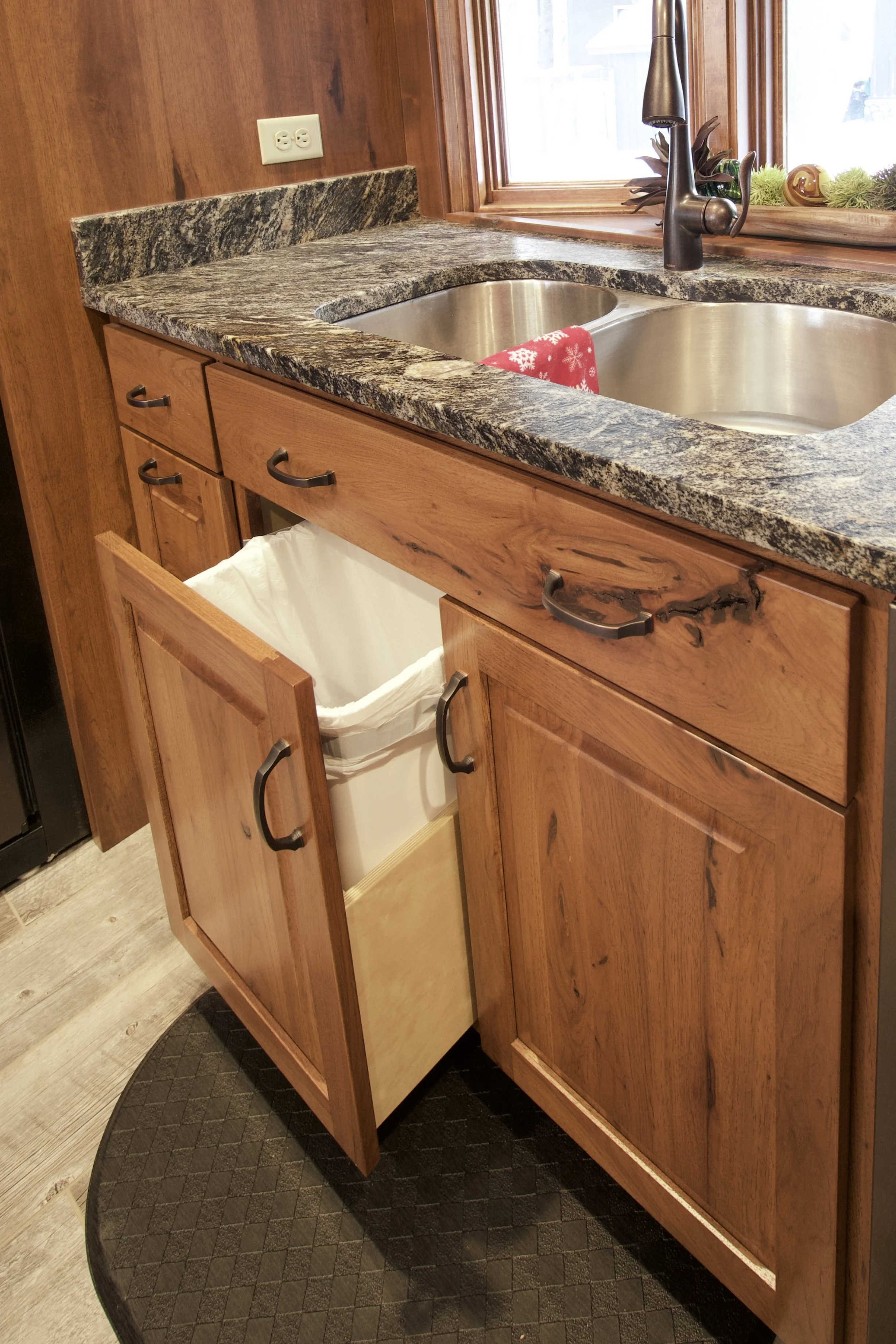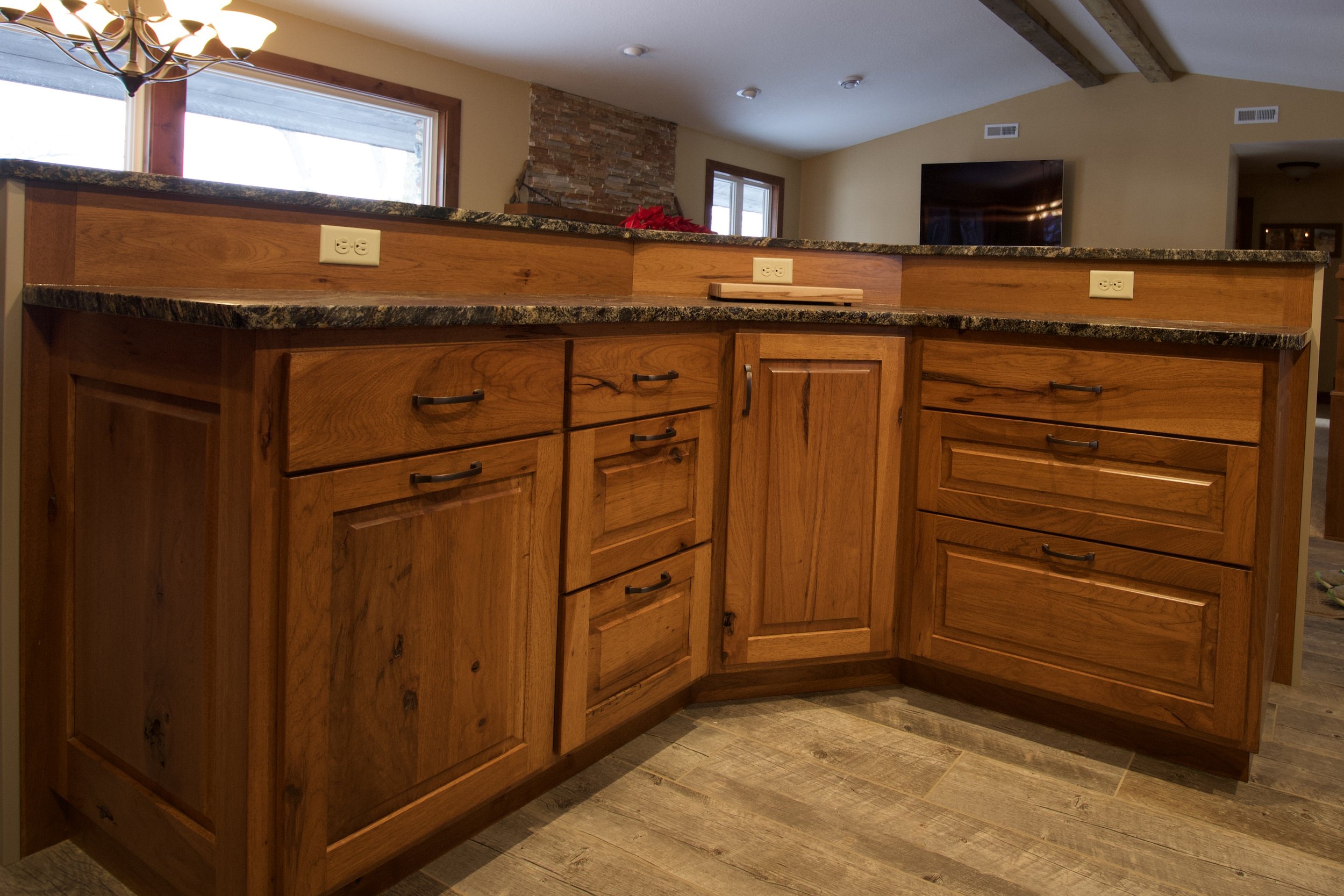 Warm hickory grain, custom glass details, and a one-of-a-kind rounded island come together to make this kitchen truly unique. From the handcrafted hood to the natural texture in every cabinet door, every element was designed to bring rustic character and modern function into one inviting space.